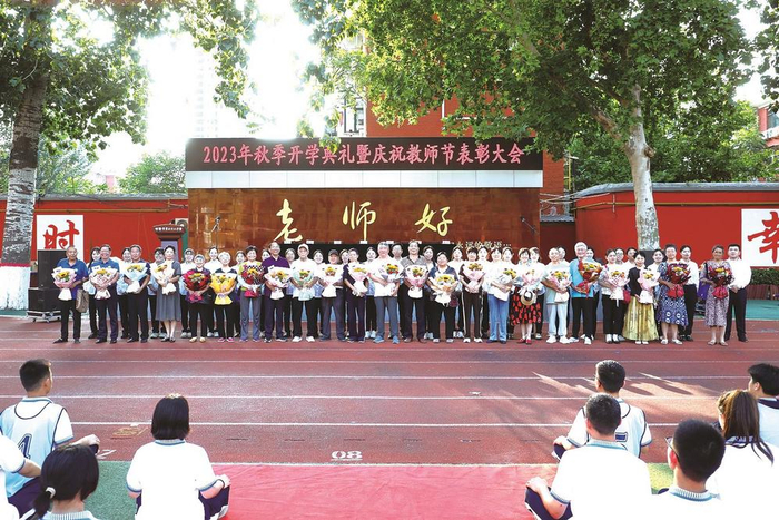 下午4点,表彰大会在庄严肃穆的国歌声中拉开帷幕,学校对市级以上荣誉获得者以及2022—2023学年优秀班主任、优秀教师、师德标兵和优秀教育工作者进行表彰。鲜花与掌声汇聚成一片荣耀的海洋。