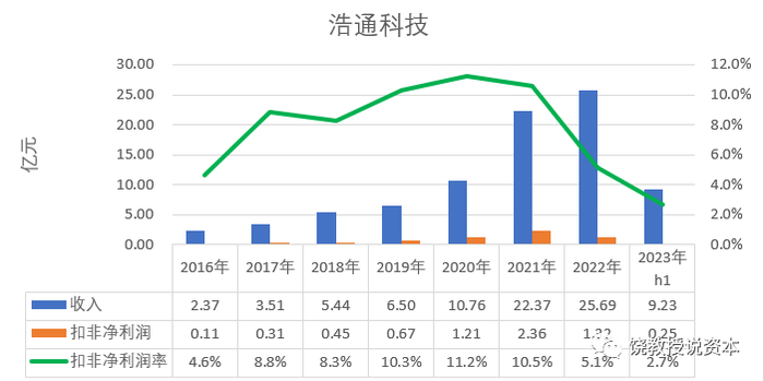 浩通科技2021年创业板上市,2017-2020年是申报期业绩呈现快速增长,收入从2017年3.51亿增加到2021年的22.37亿,4年涨了6.4倍,扣非净利润从2017年的0.31亿增长到2021年的2.36亿,4年涨了7.6倍。上市后第一年2022年,收入25.69亿,比上年涨了14.8%,扣非净利润却比上年下降44.1%。2023年上半年收入仅9.23亿,比上年同期下降46.13%,扣非净利润同比下降66%。