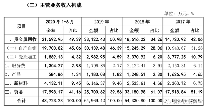 招股书中,浩通科技贵金属回收业务主要模式是自产直销模式,2019年和2020年上半年占90%以上。