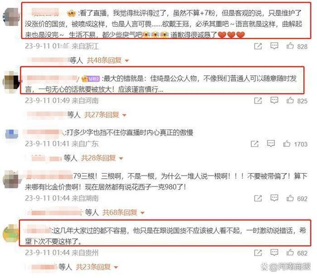 “最大的错就是:佳琦是公众人物,不像我们普通人可以随意随时发言,一句无心的话就要被放大!应该谨言慎行”,对于此类评论,有网友反驳其是“韭菜成精了”。