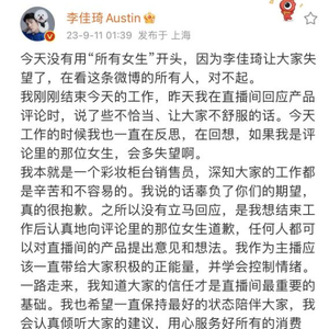 9月11日凌晨,李佳琦就言论不当发文道歉,他表示之所以没有第一时间站出来回应,是一直在工作,想结束工作后认真向评论区里的那位女生道歉,也让大家失望了,对不起。