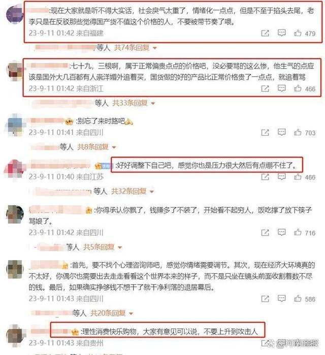评论区中,大部分网友并不买账,高位热评内容大部分是这样的:“你挣着普通人的钱,到头来嘲讽普通人贫穷”“你得承认你变了”“别忘了来时路吧”“赚钱已经赚到忘本了”“真的不想做就退休吧,起码还给大家留个好印象,这样看着太不讲究了”“你已经没有普通打工人的心态了,赚到钱就飘了呗”