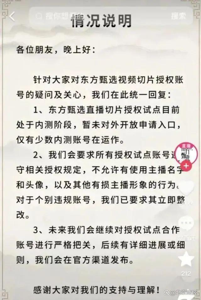 值得一提的是,东方甄选9月8日凌晨曾发布情况说明回应视频切片授权的疑问称,直播切片授权试点目前处于内测阶段,暂未对外开放申请入口,仅有少数内测账号在运作。
