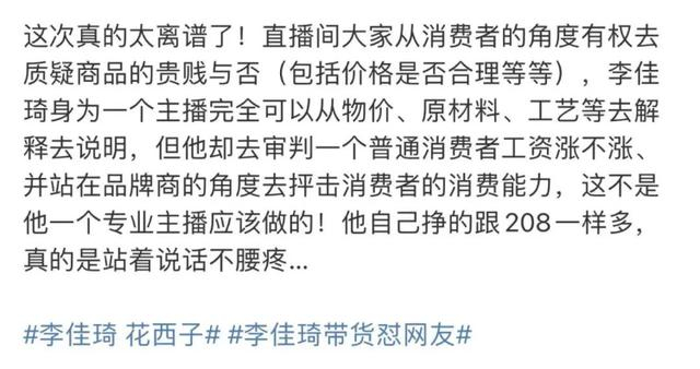 有网友表示,“李佳琦力挺花西子没啥问题,他最后那句‘这么多年了工资涨没涨,要找自己的问题,有没有认真工作’真的有点刺耳了,认真工作的人很多啊,怎么有种你穷你才觉得贵的感觉。”