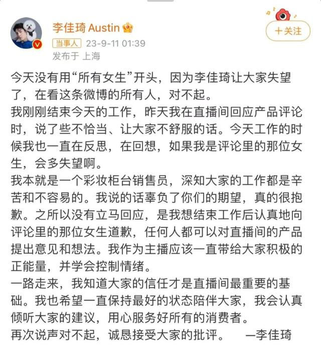 9月11日凌晨1点多,李佳琦就10日晚上直播间“怼网友”发文道歉。