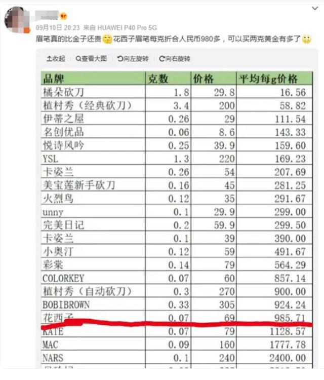 “李佳琦言论”事件后,很多网友开始关注花西子产品的价格。有网友统计,花西子眉笔每克980多元,高于大部分美妆品牌,如植村秀的经典砍刀眉笔,230元3.4G,平均每克67.6元。按照李佳琦直播间79元买一支送两支替换装来算,每克价格也达到了329.2元。网友表示,花西子这价格可以买两克黄金有多。