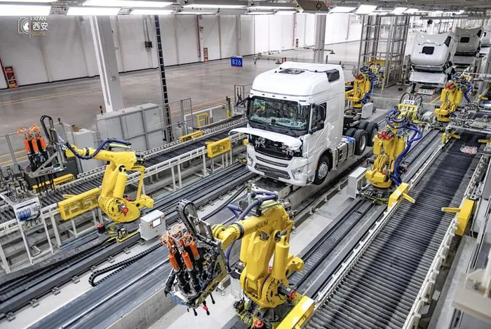 陕汽重卡扩能项目总装生产线,工业机器人正在进行汽车轮胎自动化装配作业。