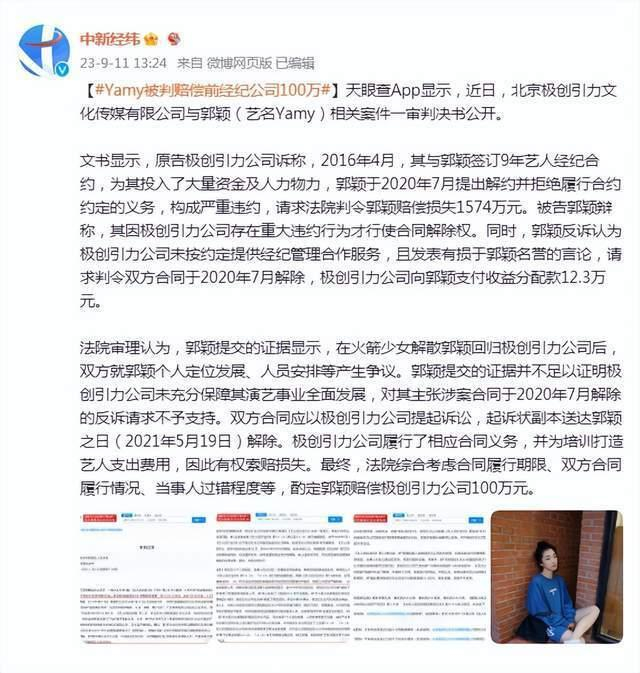 天眼查App显示,近日,北京极创引力文化传媒有限公司与郭颖(艺名Yamy)相关案件一审判决书公开。