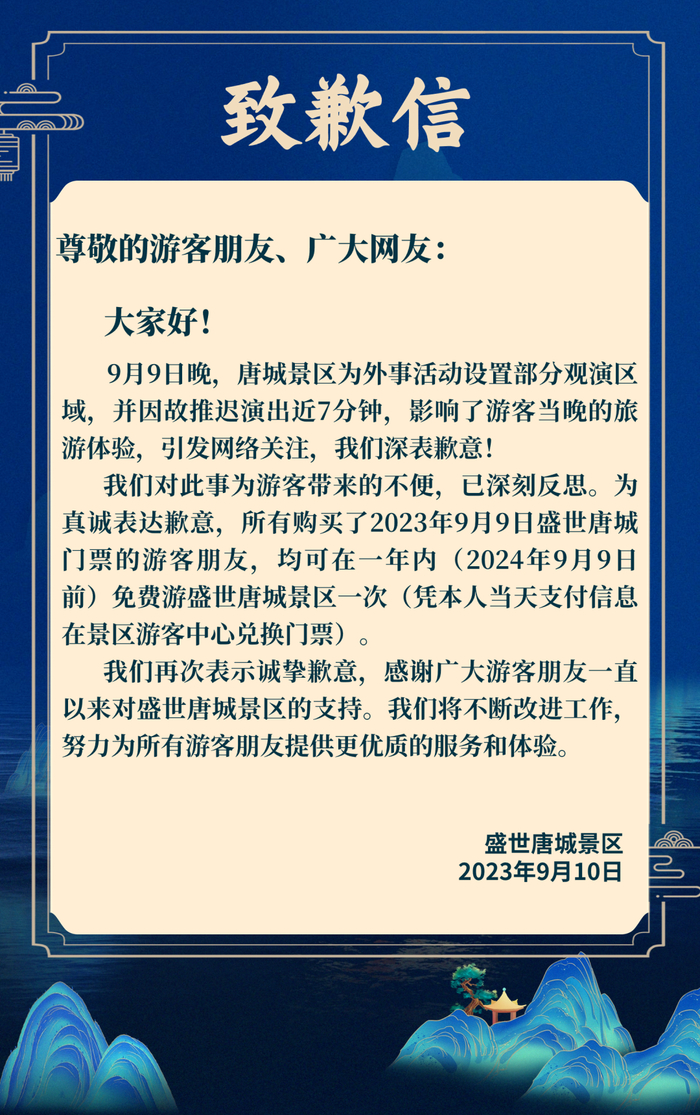 9月10日晚,“襄阳盛世唐城”微信公众号发布致歉信。信中表示,景区当晚为外事活动设置部分表演区域,因故推迟演出近7分钟,影响了游客的旅游体验。为表达歉意,所有购买了9月9日门票的游客,可在一年内免费游览景区一次。
