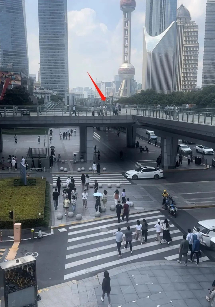 而网传的第三张图片拍摄地也位于陆家嘴环路的这座连廊天桥上,所拍的画面中,右侧是东西向的延安东路隧道银城中路匝道。