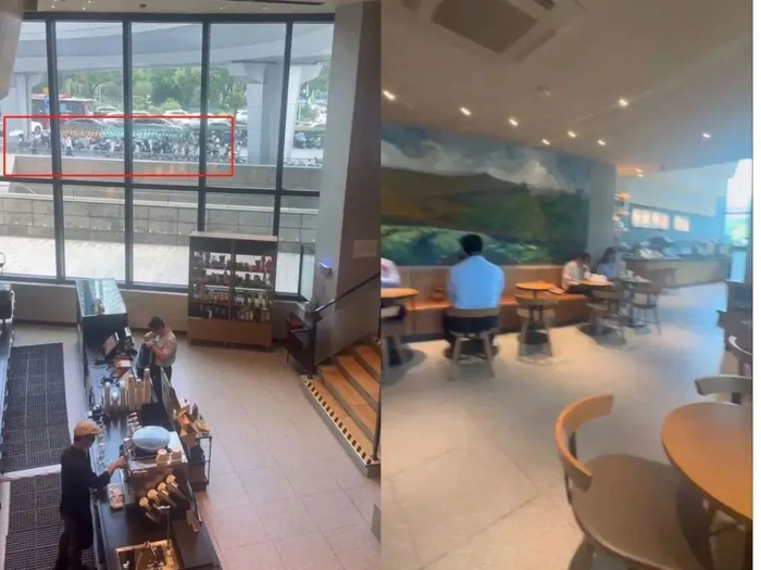 网传图片中比较具有辨识度的店面设计、门口台阶、地砖、窗口反射的电梯画面等,都能与星巴克(览海国际广场店)的环境图一一对应。