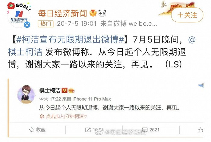 2017年代表人类围棋最强战力大战阿尔法狗,让不看围棋的人也关注到了他。后来柯洁也一直在微博十分活跃,直到2020年突然宣布无限期退出微博,退回到B站这一舒适区。