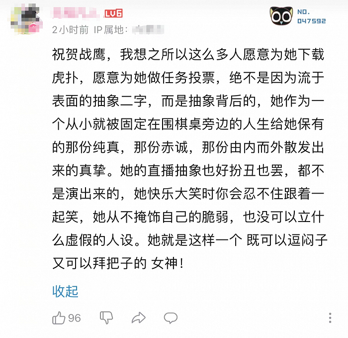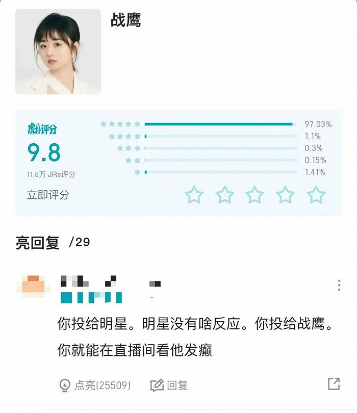 作为主播,战鹰的粉丝粘性强得不是一点半点,就算粉丝规模不及诸多娱乐圈明星,但打投能带来更多的成就感。诚如在战鹰虎扑评分页面最高亮的评论所言,“你投给明星,明星没啥反应,你投给战鹰,你就能在直播间看她发癫。”