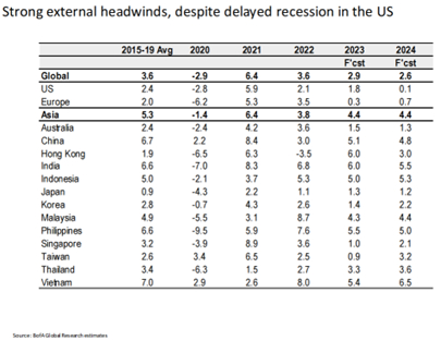 再来看亚洲方面,整个亚太地区的增速预计为4.4%,较去年3.8%的增速有所上升,主要得益于大中华区经济增速回暖。我们预测中国今年的增速是5.1%,较去年的3%有明显的提升;香港作为大湾区中重要的一环,在历经2022年的衰退后(GDP增速为-3.5%),随着今年经济回暖、防疫放开和旅游恢复,预计香港经济增速能回到6.0%。然而,除了大中华区外,亚洲其他经济体今年增速大都预计较去年呈现下降趋势。主要原因是东南亚对于欧美市场的依赖度远胜于对中国市场依赖,这意味着即使中国今年的需求强劲,由于欧美需求下滑,亚洲其他主要经济体仍将面临外部需求下降的冲击。