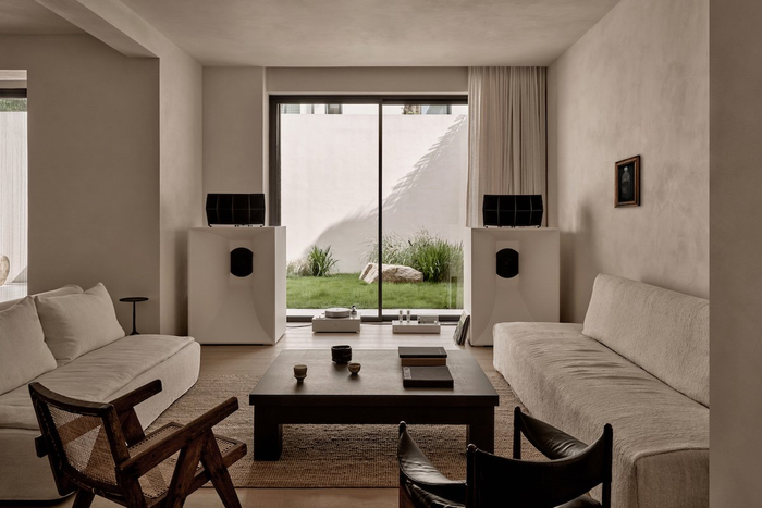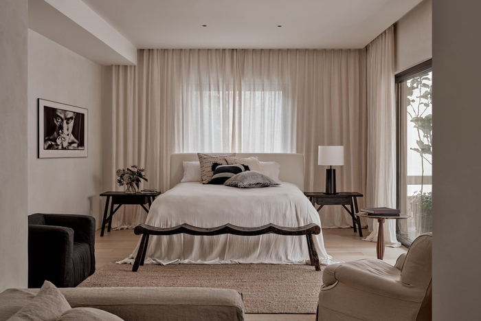 整个房间以黑白灰和大地色系营造一种宁静和谐又充满质感的空间氛围,强调线条的简洁和比例的平衡,注重形式与功能的完美结合,皆以质朴的方式呈现出最具触感的设计,还原生活的本质,呈现一种“温暖的野蛮感”。