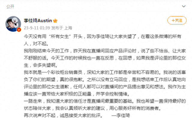 9月11日凌晨1点多钟,李佳琦发微博向网友致歉,称在直播间回应产品评论时,说了些不恰当、让大家不舒服的话。“今天工作的时候我也一直在反思,在回想,如果我是评论里的那位女生,会多失望啊。”