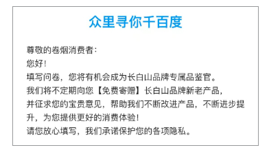 记者了解到,该公司还开展了长白山品牌专属品鉴官活动。只要扫描微信二维码、填写调查问卷成为长白山品牌专属品鉴官,就可以不定期免费品鉴该公司生产的长白山香烟的新老产品。记者注意到,填写调查问卷时必须填写详细的个人信息。