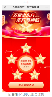 随后,界面跳出《红包领取公告》,“点亮星星”后跳转到新界面,界面显示“恭喜您!获得1.88元红包”。