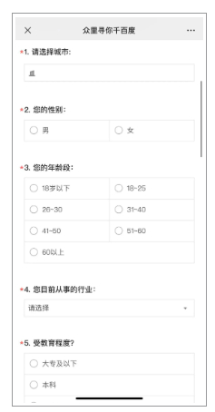 调查问卷中,消费者必须填写所在城市、性别、年龄段、目前从事行业、受教育程度、偏好吸食品类等内容。