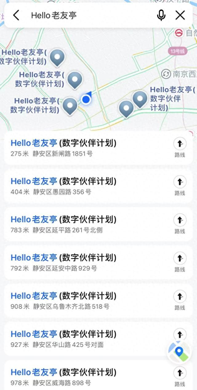 只需在手机的地图APP里搜索“HELLO老友亭”。地图显示,静宝所在位置一公里内便有7个点位。