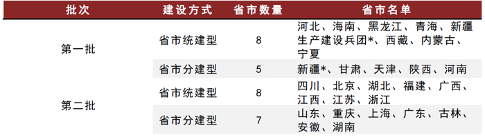 2)由于计划单列市下沉空间较小,表中未进行统计;第一批次中的贵州省,第二批次中的辽宁省、山西省、云南省根据公开资料难以进行判断,表中未进行统计,后续报告及图表中以上四省的下沉建设空间预测将参考同批次同类型公司进行