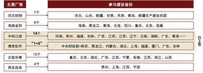 注:1)根据采招网公开订单整理,因此存在不完全统计;2)博思软件及中科江南的承建省份数量来自于公司2022年年报,其他厂商的承建省份数量源自截至2023年1月底的采招网订单统计;3)图中“新疆”指新疆维吾尔自治区,与“新疆生产建设兵团”在财政体制上相互独立