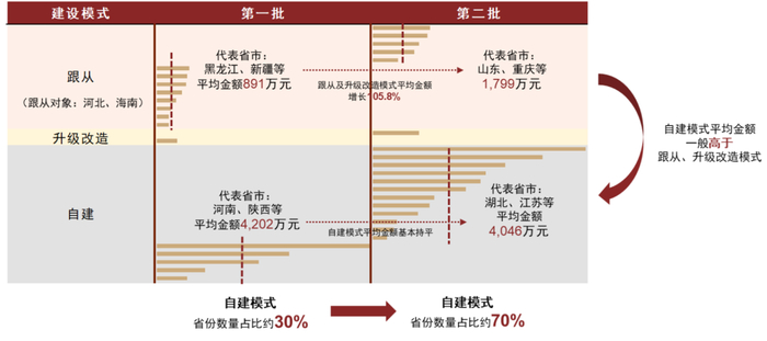 “两个批次”:第一批多采用跟从和升级改造模式,第二批多采用自建模式