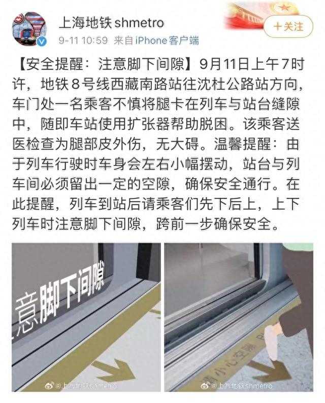 事后,上海地铁通报,11日上午7时许,地铁8号线西藏南路站往沈杜公路站方向,车门处一名乘客不慎将腿卡在列车与站台缝隙中,随即车站使用扩张器帮助脱困。该乘客送医检查为腿部皮外伤,无大碍。