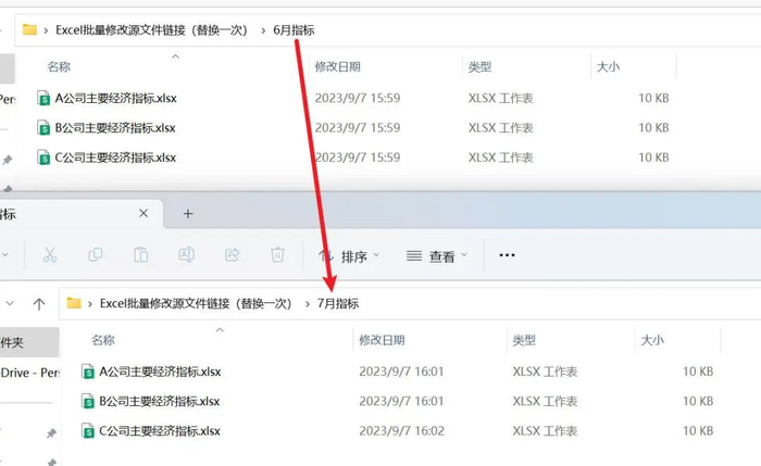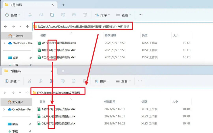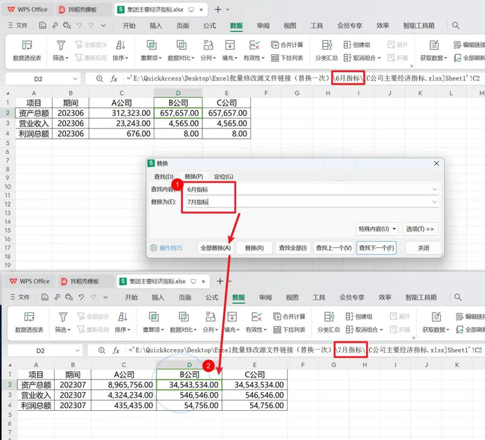 这种方式适用于公式链接只需要一次替换的情形,如下图所示,只需要将「6月指标」替换为「7月指标」,就可以完成公式链接的替换了,使用时我们需要注意对比新旧表格所在的文件路径。