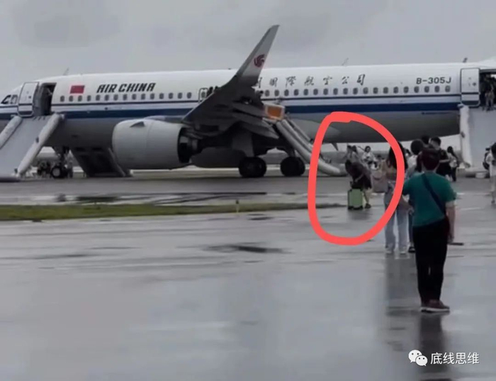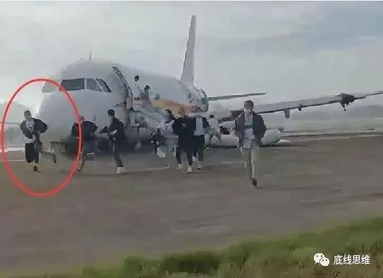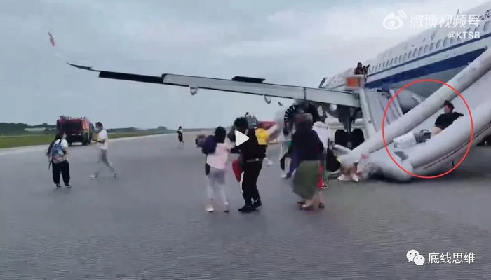 红圈中乘客带着绿色拉杆行李箱从飞机内撤离