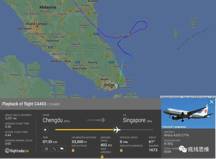 在媒体采访中乘坐该航班的旅客表示,降落前40分钟飞机客舱内就开始冒烟了。如果以16:14往前40分钟来推算的话,正好是在CA403进入雕门岛上空开始下降高度的时候,而且刚好进入新加坡的管制范围。之前也有想过为啥空中发生冒烟事件后继续选择降落新加坡,结合实际情况一看答案很明显了:新加坡就是最近的机场,而且已经处于高度下降的过程之中了。而且在新加坡管制区内降落新加坡是最好协调的,新加坡机场的应急处置条件也更好。