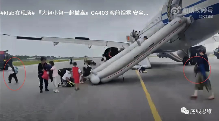 但是在这次CA403火情中,我们依然能看到很多本不应发生的事。从现场视频中我们可以清楚的看到,有不少旅客在用充气滑梯从客舱内撤离时还穿着鞋子(高跟鞋),并且拿着背包甚至行李箱撤离。