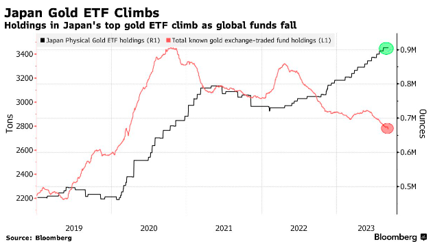 自新冠疫情颠覆世界经济以来,日本投资者对黄金支持的ETF产品也表现出了浓厚兴趣,相关持有量从2020年开始强劲增长。这与全球总体情况形成了鲜明对比,由于投资者担心美联储将在更长时间内维持高利率以抑制顽固的通胀,全球投资者继续回避黄金,黄金ETF持仓量出现了大幅流出。较高的借贷成本对不产生利息的黄金来说通常是负面的。