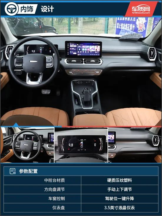 在内饰方面,试驾车辆的设计中规中矩,既有硬派气息,也有时下主流的设计特色。新车采用悬浮式液晶仪表以及12.3英寸中控屏,中控台下面有空调控制以及部分车辆功能的操控面板。三辐式方向盘的操作区域看起来方正规整,有一定的硬朗气息。另外,在中控台用料方面,试驾车辆采用了硬质压纹塑料进行覆盖,虽然摸起来的手感较硬,但看起来还是有一定质感的。