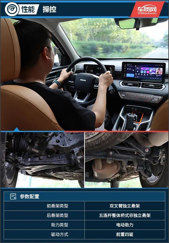 在操控方面,试驾车辆的方向盘存在轻微虚位,但并不会造成多大影响,总体看来,转向还是较为精准的。试驾车辆采用了前双叉臂独立悬架+后五连杆整体桥式非独立悬架的组合,虽然有着不错的舒适性,但由于悬架行程略长,所以在中高速转弯时有着相对明显的侧倾,不过平时的转弯状况,它的表现还是不错的。