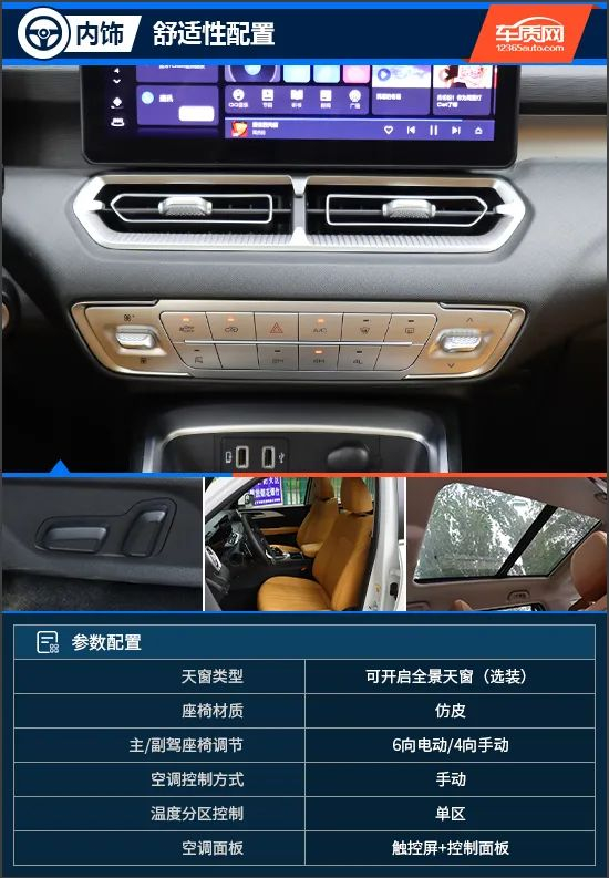在舒适性方面,试驾车辆选装了可开启全景天窗,该天窗以及配套的遮阳帘均可通过手动或者语音控制来开闭。座椅采用仿皮材质的设计,质感和触感都还算不错。空调操控方面,其采用了触控屏+控制面板的操作方式,在科技化的同时保留了一定的物理操控机构。