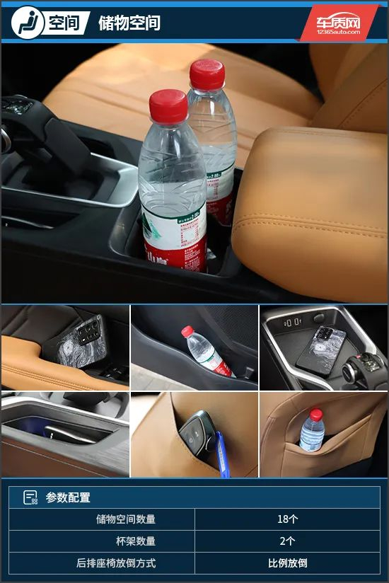 储物空间方面,试驾车辆有着不错的表现,虽然没有配备新能源车型常用的双层中控地台设计,但试驾车辆的零散储物空间较多。除了挡位前端的储物格以及门板上的常规储物空间以外,换挡杆两侧配有储物槽。同时,前排座椅内侧还各有一个储物袋设计,虽然空间较小,但对于临时的随身用品来说绰绰有余。