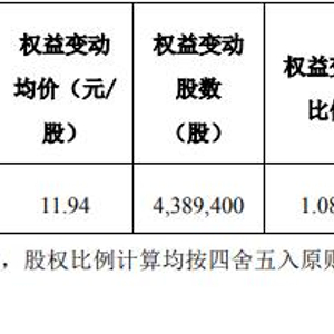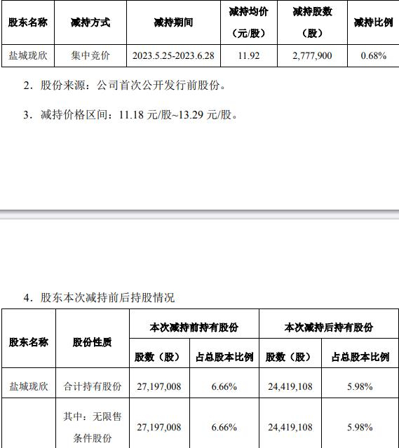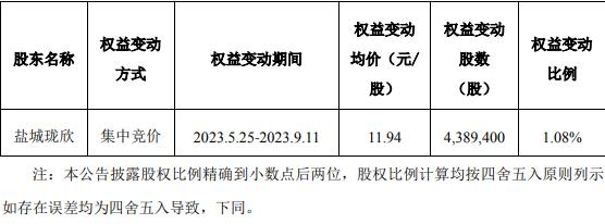 公告显示,公司近日收到盐城珑欣企业管理合伙企业(有限合伙)(以下简称“盐城珑欣”)出具的《关于权益变动公司股份数量超过1%的告知函》,盐城珑欣于2023年5月25日至2023年9月11日期间以集中竞价交易的方式累计权益变动4,389,400股,持股比例由6.66%变动为5.58%,权益变动比例为1.08%,权益变动均价11.94元/股。