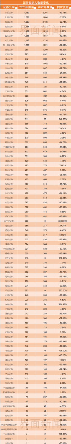 与此同时,国泰君安证券、长江证券、光大证券、第一创业证券的证券经纪人数量也逾千人。相较于去年同期,招商证券、天风证券的经纪人队伍已经跌破千人。