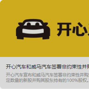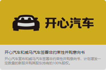 开心汽车官方公众号发布,开心汽车于9月11日正式宣布已经和WM Motor Holdings Limited(简称“威马汽车”、“WM Motor”)签署了非约束性并购意向书,计划增发一定数量的新股并购其股东持有的100%股权。