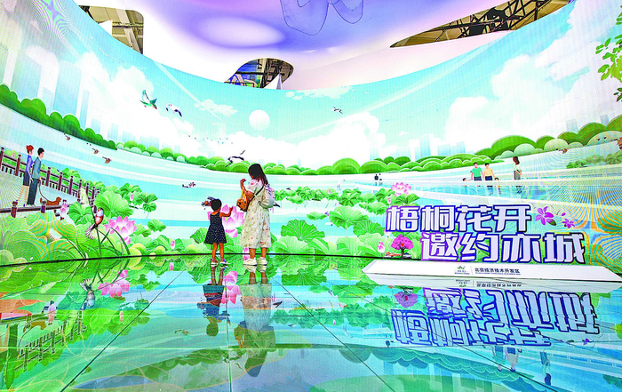 这张照片胜在色调清雅、光影和谐、层次丰富。环形大屏上,晴空朗朗,飞鸟翩跹,绿荷映红莲,亭亭水中间,远处若隐若无的都市天际线与近处悠闲自得的市民游客点缀其中,构成一幅人与自然和谐共生的美丽图景。地面上的倒影清晰明了,使得这一美景得以铺展延伸。在此基础上,参观者行走其间,天然与屏幕、地板形成巧妙的互动,宛如“人在画中走,画在景中游”。