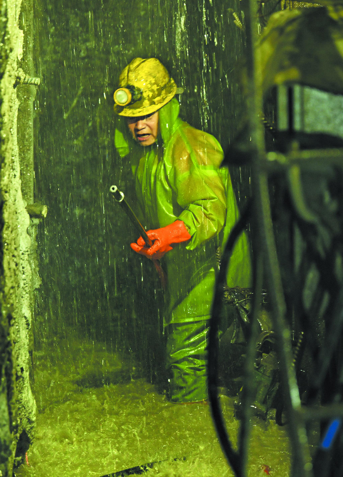 这是一张层次丰富,细节满满的照片。看表情姿态,工人手握工具,弓步迈开扎在水中,表情坚毅,紧咬牙关搞建设;看环境艰苦,工人全副武装,对抗着隧道的黑暗和积水,脚底污水漫过小腿,头顶的水亦如雨落下,分不清工人脸上是水是汗。照片明暗对比强烈,人物主体突出,所拍摄的输水隧洞建设场景具有陌生感和震撼感,引起读者好奇和兴趣,再结合文字,能够让读者对这一重大工程建设过程的艰辛不易有更深体会。正如罗伯特 •卡帕所说,照片拍得不够好是因为离得不够近,这张照片正是摄影记者克服艰 险走近现场、融入场景拍摄的产物,具有强烈的真实感和冲击力。