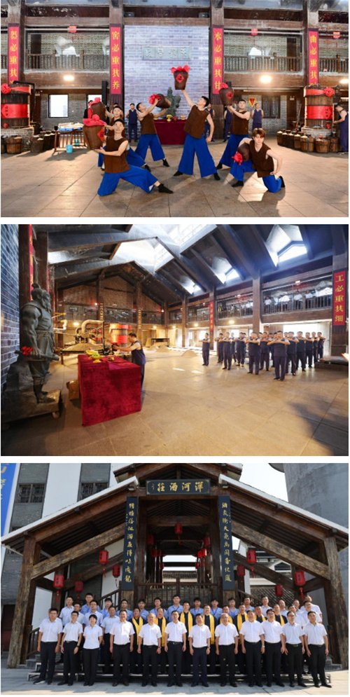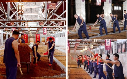 开吉门,酿头排!吉时到,梦之蓝中央酒区前,酿酒师傅们整装待发迎接头排生产,公司领导擂鼓三声,为新一轮的酿酒周期纳吉。进入老窖池群,揭红布,定窖池,颂祖训,起窖帘,请酒醅……“一锹起,白露丰润,紫气东来;二锹起,窖开头排,绵柔传世;三锹起,天地同酿,中国头排!”在酿酒师傅们颇具韵律的一锹一掀中,百年老窖的神采渐渐展露出来,香味浓郁的酒醅在沉淀一夏之后,缓缓释放出更有韵味的成熟之美。