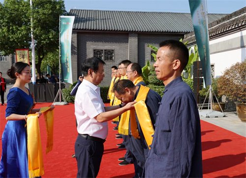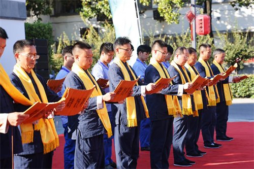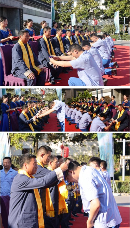 拜师仪式现场,中国酿酒大师钟雨为酿酒系统不同岗位的10位师傅代表佩披丝帛,增其师者荣光,愿洋河酿造技艺传承继往开来、基业长青。徒弟们向师父呈拜师帖、行拜师礼、敬拜师酒;师父们向徒弟赠予《洋河酒训》,授非遗传承勋章,并戒尺加身,勉励其不忘初心,坚守匠心。
