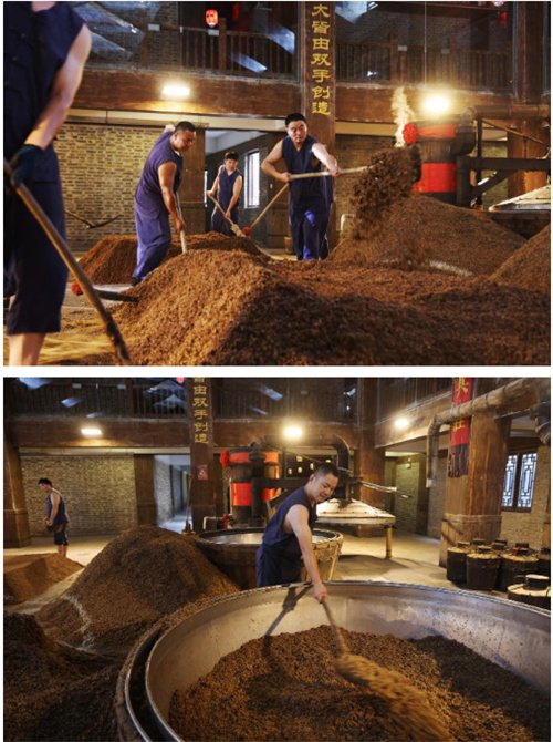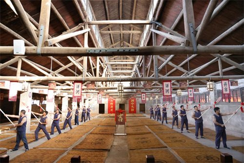 装甑是最考验酿酒技艺的。“扒桶子喽,有绝招咯!轻松匀啊,薄准平咯!”一声铿锵有力的装甑号子合起,老师傅们16个动作2秒内一气呵成,辗转腾挪间蕴含了“轻、松、匀、薄、准、平”的技艺之法和心性之妙,将老匠人磨练数十年的功力发挥得淋漓尽致。洋河酒酿造技艺通过一代代酿酒匠人灵巧的双手和执着的匠心,跨越历史长河延续至今,其间传承着古人生态酿造的智慧,也蕴含着洋河创新酿造绵柔的密码。