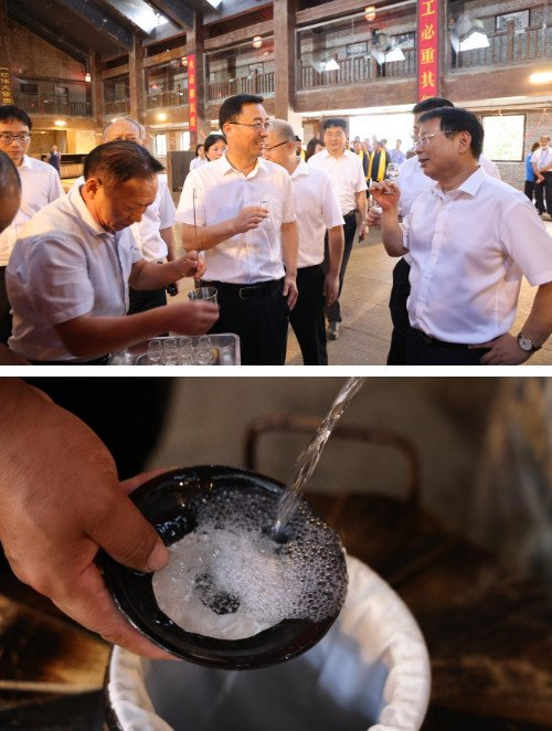 从压窖到开窖,180天的蕴化与洗礼,春分到白露十二个节气的蛰伏与蜕变,少一分都不够完美,短一秒都无法“头排”。当车间第一坛美酒“瓜熟蒂落”时,大家忍不住热情欢呼:“出酒喽!淌好酒咯!”涓滴珍贵的2023年头排原酒汩汩流出,酒气蒸腾,酒香飘逸。礼仪为众人端出酒杯,呈上新酿的头排酒,一起为今年的开窖欢庆,举杯共饮。
