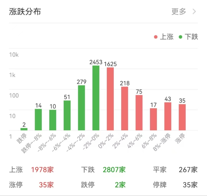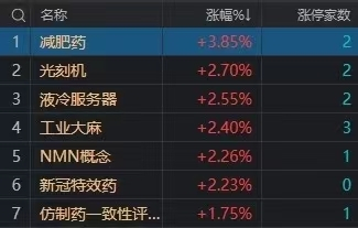 总体上个股跌多涨少,两市超2700只个股下跌。沪深两市今日成交额7083亿,较上个交易日缩量1327亿。板块方面,减肥药、光刻机、工业大麻、养鸡等板块涨幅居前。