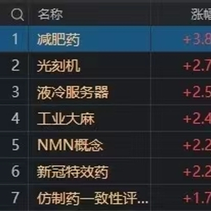 9月12日,大盘全天震荡调整,三大指数均小幅下跌。盘面上,医药股持续活跃,其中减肥药方向领涨,常山药业20CM涨停,德展健康涨停;工业大麻概念股开盘拉升,通化金马、莱茵生物涨停。光刻机概念股午后大涨,京华激光、联合精密涨停。CPO概念股一度冲高,光迅科技、铭普光磁涨停。