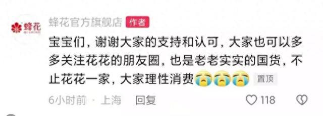 此外,12日上午,蜂花在直播评论区回应称“谢谢大家的支持和认可,大家也可以多多关注花花的朋友圈,也是老老实实的国货,不止花花一家,大家理性消费”。