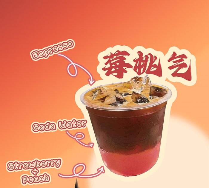 来源于不爱吃各种甜食的老板娘,误打误撞将小半瓶苏打水倒入莓莓桃桃果汁里面,然后又注入了一份浓缩咖啡;然后得到了一杯,果汁感爆棚,又缓解了咖啡的苦涩,还降低了莓莓桃桃果汁的甜度的特调美式。一举三得,从而使此款产品变成了,这个夏天如果不淘气,就不会喝到好喝的冰咖啡哟!